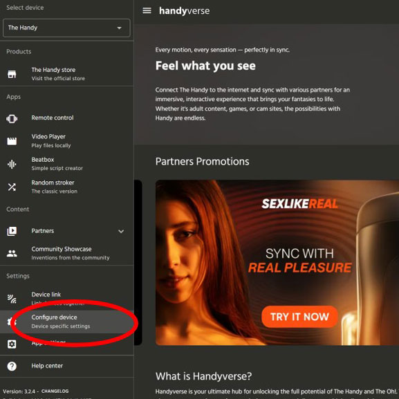 1.HandyVerse(https://handyverse.com/ )にアクセスし、左メニューのConfigure deviceの手順で進めます。