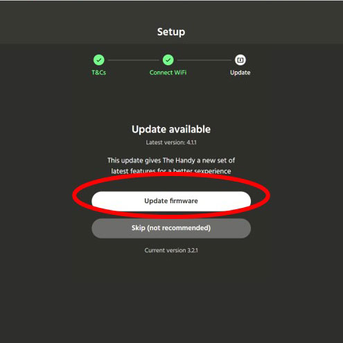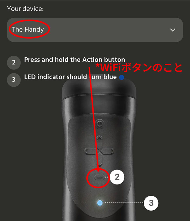 6.Your device がThe Handyになったら、ランプの上のボタン(WiFiボタン)を長押しします。