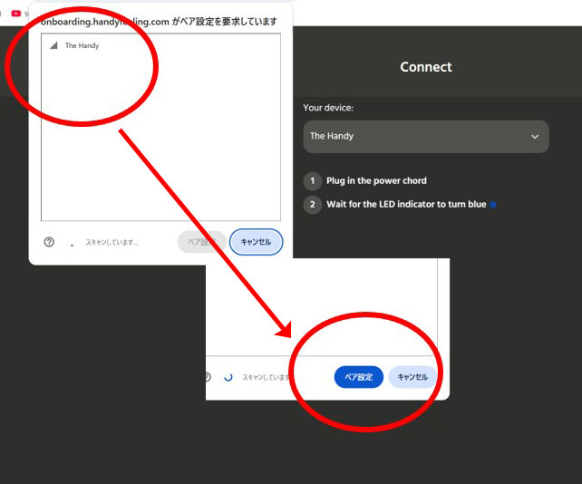 8.ダイアログの The Handy をクリックすると [ペア設定]ボタンが青になりますので、青になった[ペア設定]を押下します。