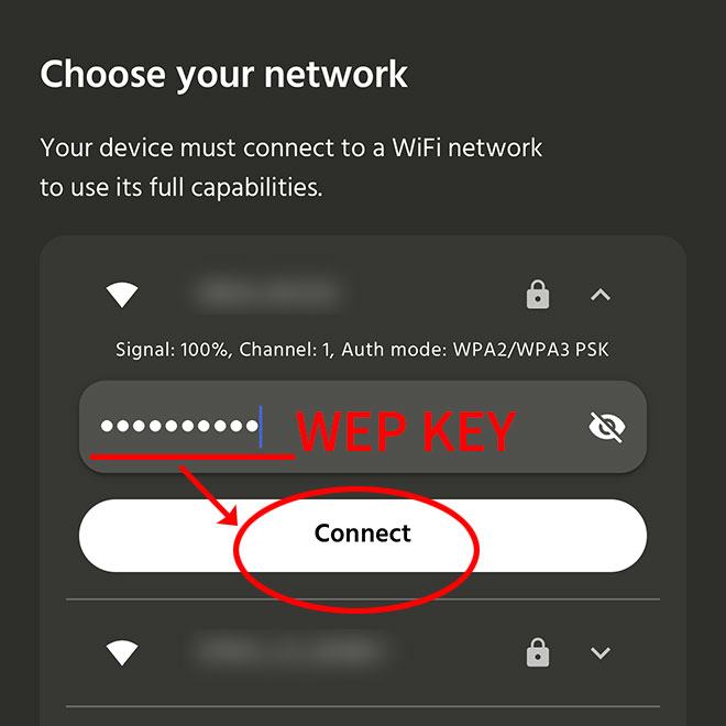7.WiFi のWEP KEY(暗号化キー)を入力し、[Connect]ボタンをタップします。